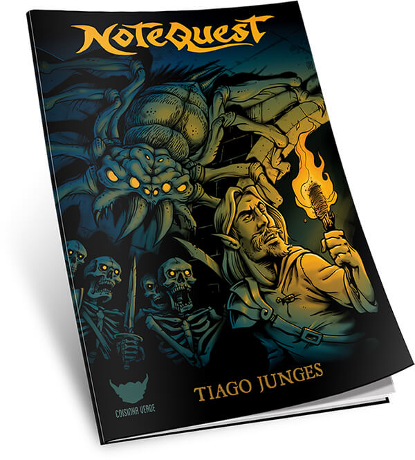 Foi então que descobri o NoteQuest, do Tiago Junges (não, não sou eu, hahaha!). Ele criou um RPG minimalista focado na exploração de dungeons. Tudo o que você precisa é papel, lápis e alguns dados de 6 lados. Parece simples, mas a mágica está na aleatoriedade.